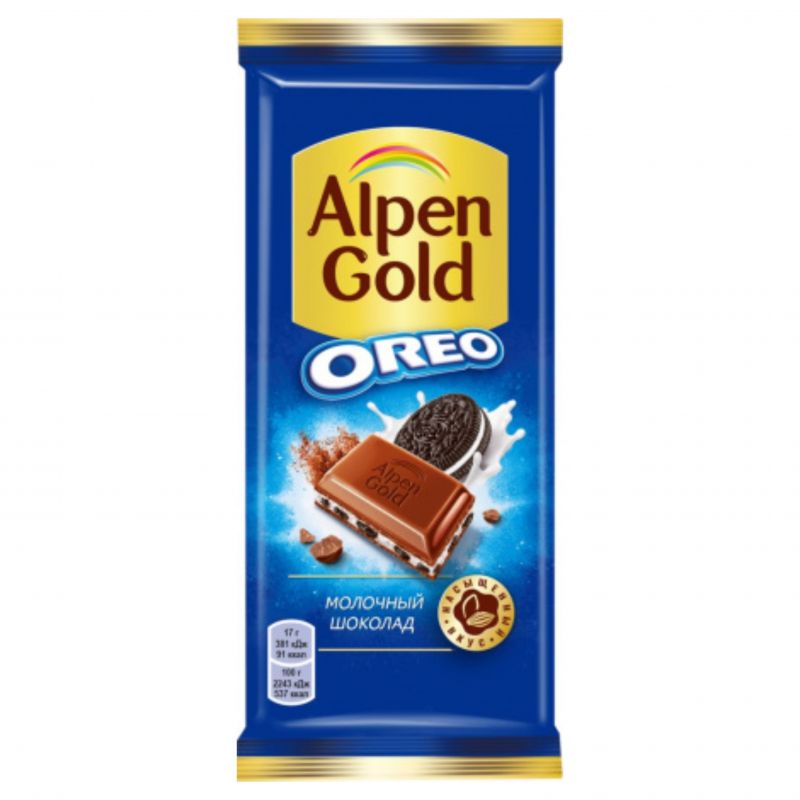 Ալպեն Գոլդ Օրեո թխվածքաբլիթով շոկոլադե սալիկը 85 գրամանոց համեղ համադրություն է նուրբ կաթնային շոկոլադի